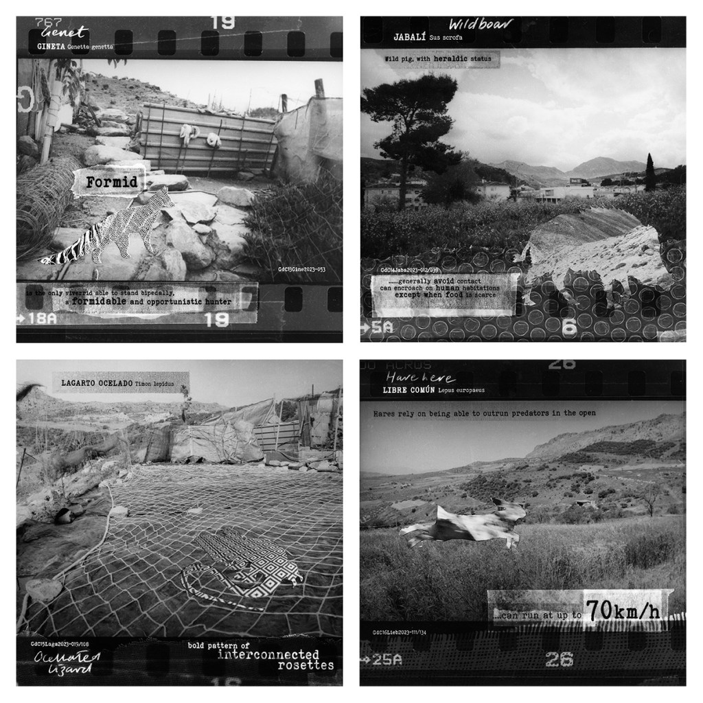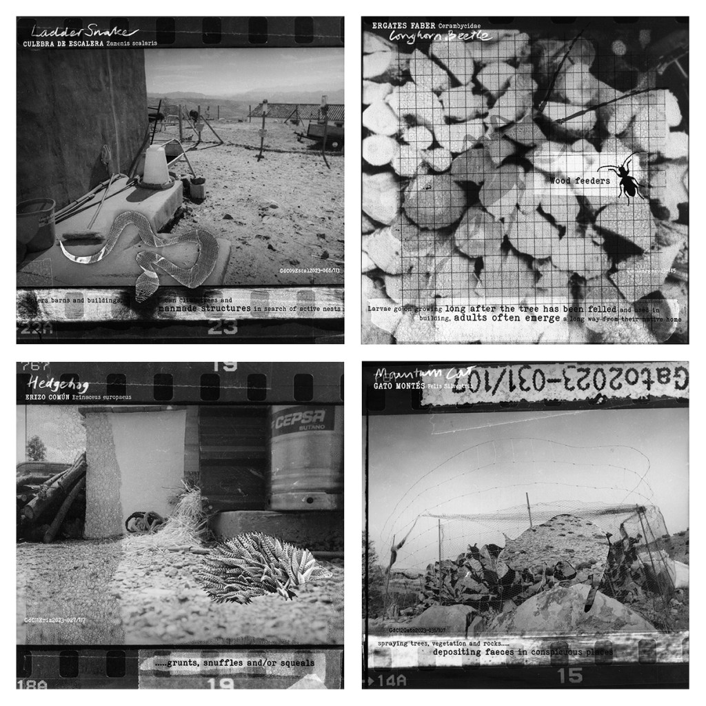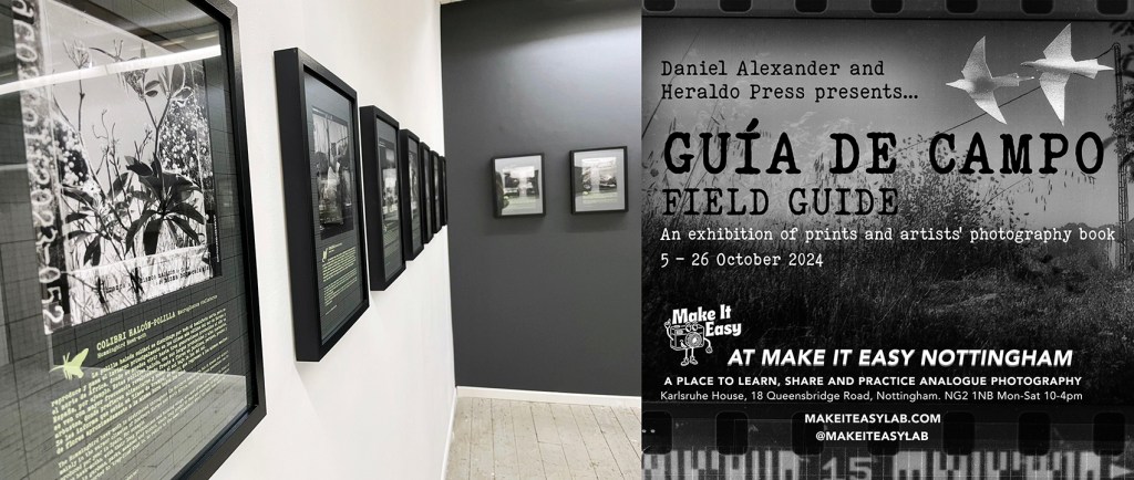24 numbered black and white photographic prints contained within the hand-bound Guía de Campo – Field Guide book (Printed in 2023 on Ilford 10″x 8″ paper each cropped to 20cm x 20cm)