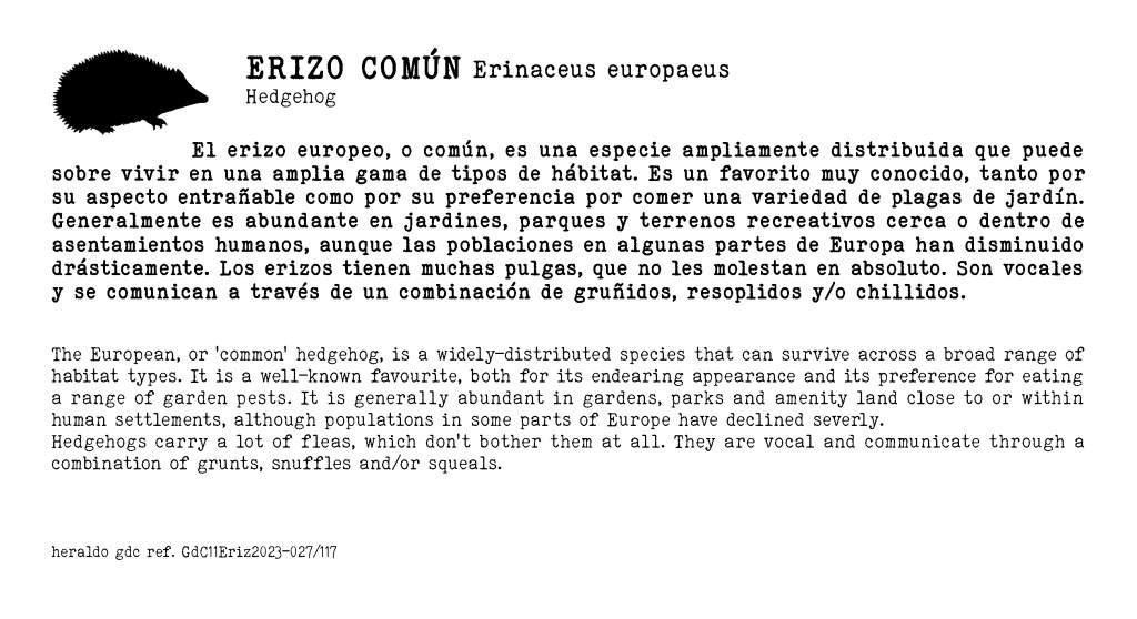 Sample book text from ERIZO COMÚN – Hedgehog, and a view of the work space during printing.