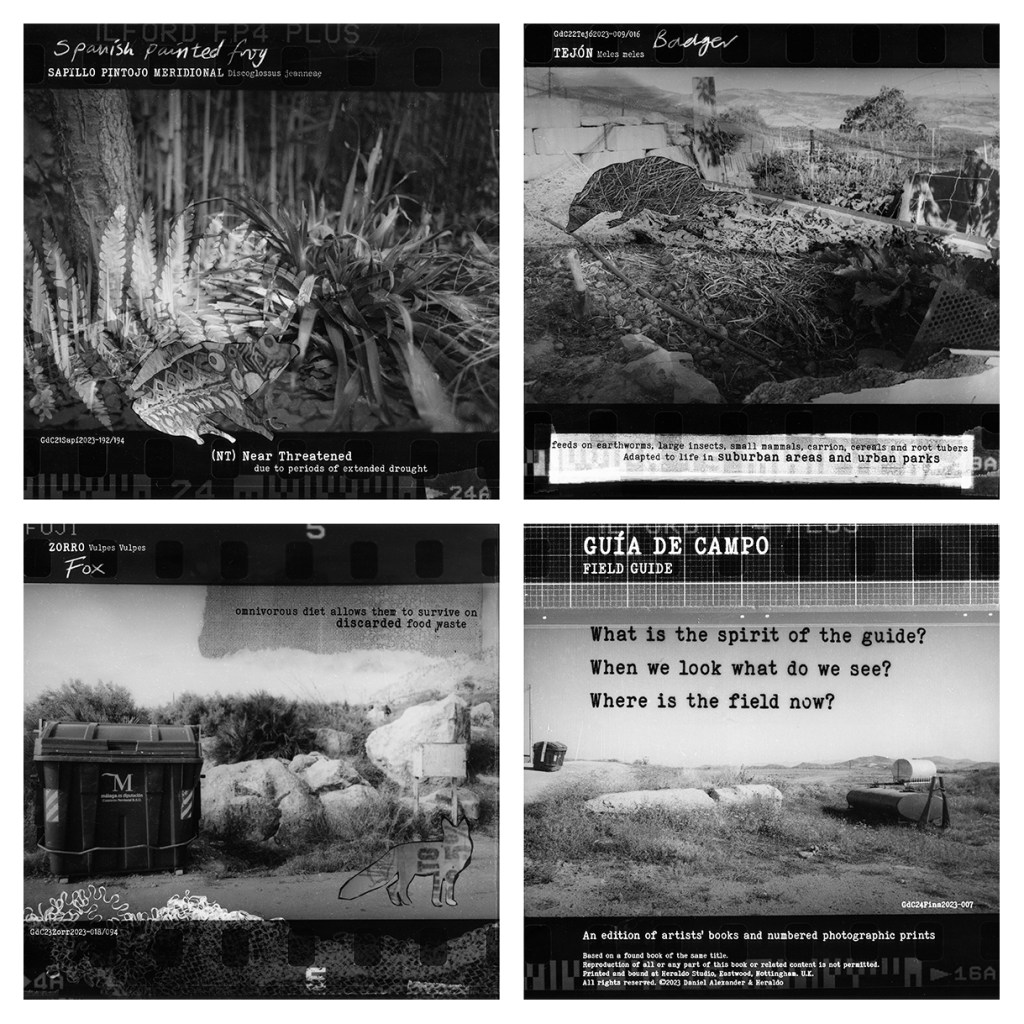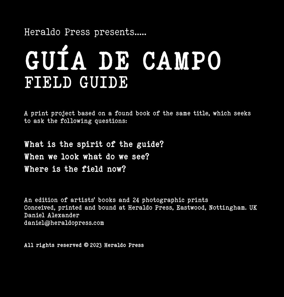 Guía de Campo – Field Guide was conceived, designed, printed, bound and published at Heraldo Press, Eastwood, Nottingham. UK, in 2023. Intellectual property rights are reserved by Daniel Alexander, whose rights to be identified as the creator of this work has been asserted by him in accordance with the Copyright, Designs and Patents Act 1988.